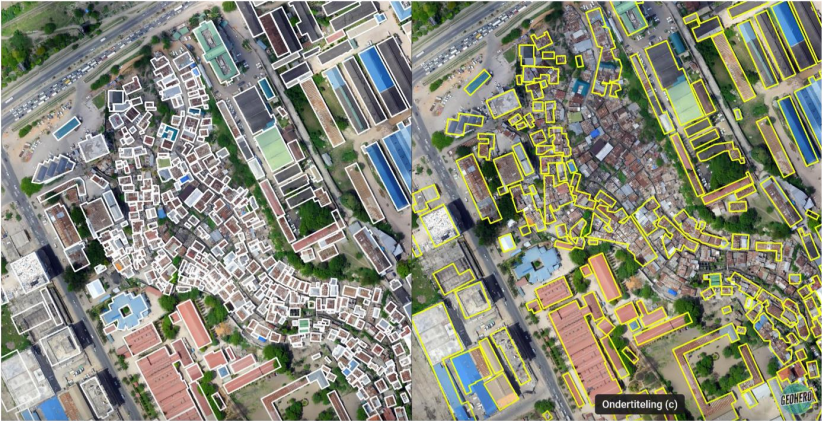 In the image above, on the left the buildings highlighted with a white outline have been digitised by the local population. On the right, the same buildings have been digitised by AI. You can spot the missing buildings in the middle easily - these types of building were clearly not considered to be buildings by this AI. However, if we then use this data to calculate how many vaccinations an area might need, how much aid might be needed, how much support might be needed after a natural disaster, then if we use the AI (yellow) version, quite a lot of people are going short!